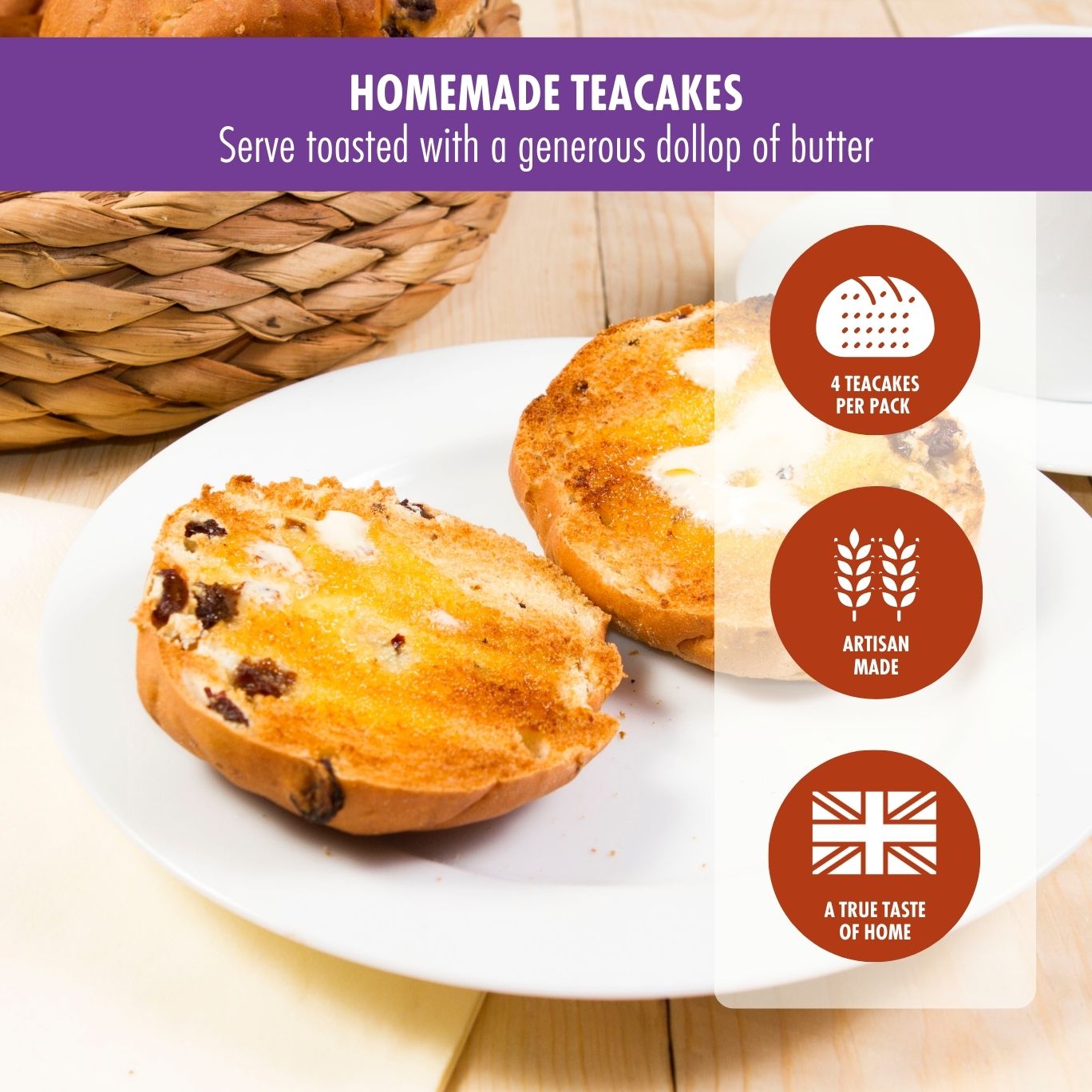 Our Homemade Teacakes should be served toasted with a generous dollop of butter.